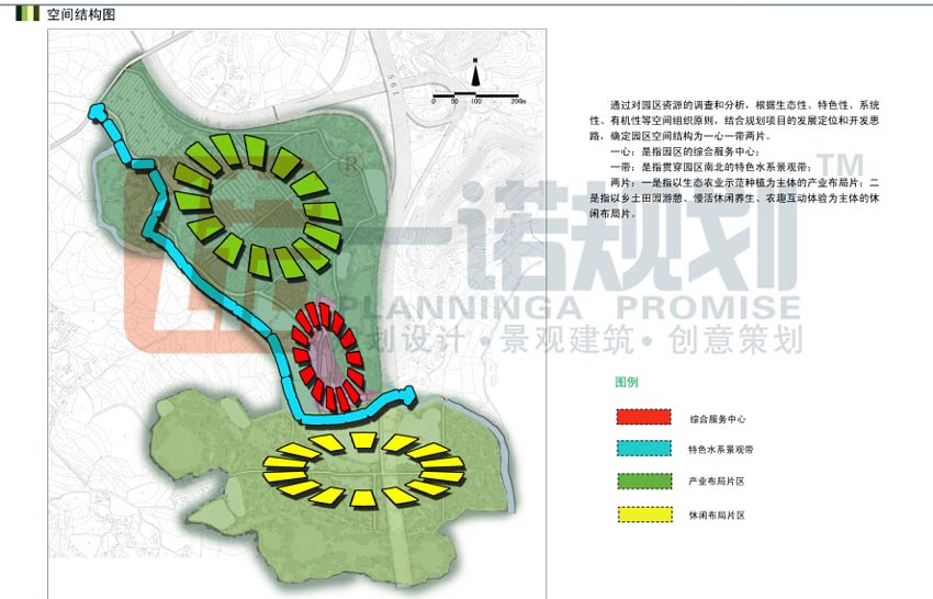 通過對(duì)園區(qū)資源的調(diào)查和分析,根據(jù)生態(tài)性、特色性、系統(tǒng)性、有機(jī)性等空間組織原則,結(jié)合項(xiàng)目的發(fā)展定位和開發(fā)思路,確定園區(qū)空間結(jié)構(gòu)為一心一帶兩片。