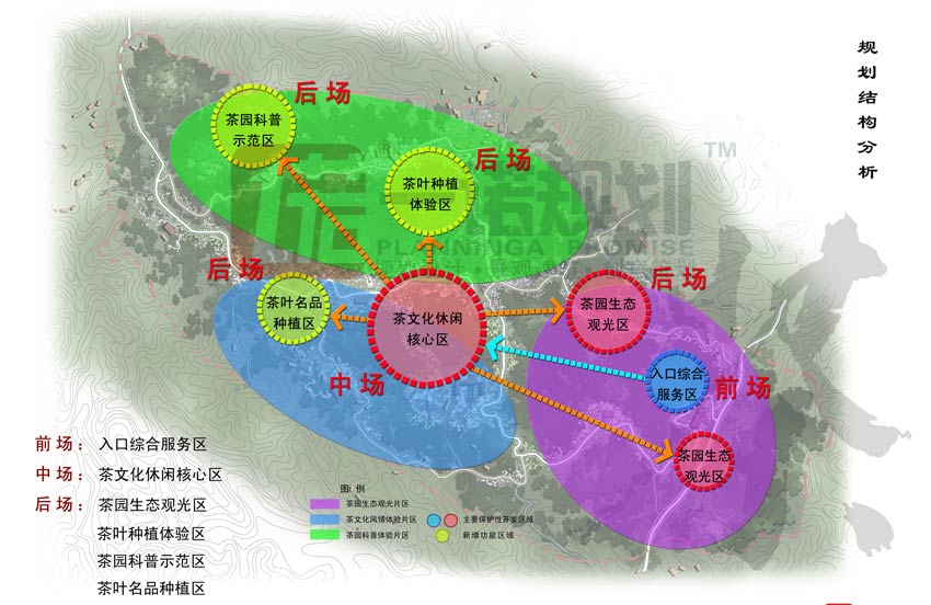 前場為入口綜合服務區(qū),中場為茶文化休閑核心區(qū),后場為茶園生態(tài)觀光區(qū)、茶葉種植體驗區(qū)、茶園科普示范區(qū)、茶葉名品種植區(qū)四個區(qū)域。