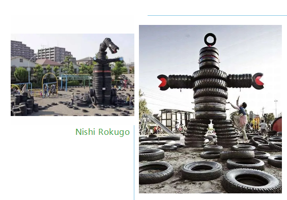 Nishi Rokugo游樂(lè)場(chǎng)的特色是恐龍、怪物、橋、滑梯和秋千都是由成千上萬(wàn)個(gè)汽車輪胎構(gòu)成,周圍還散布著輪胎,供孩子和父母堆疊、滾動(dòng)、跳躍和攀爬,盡情地玩耍。
