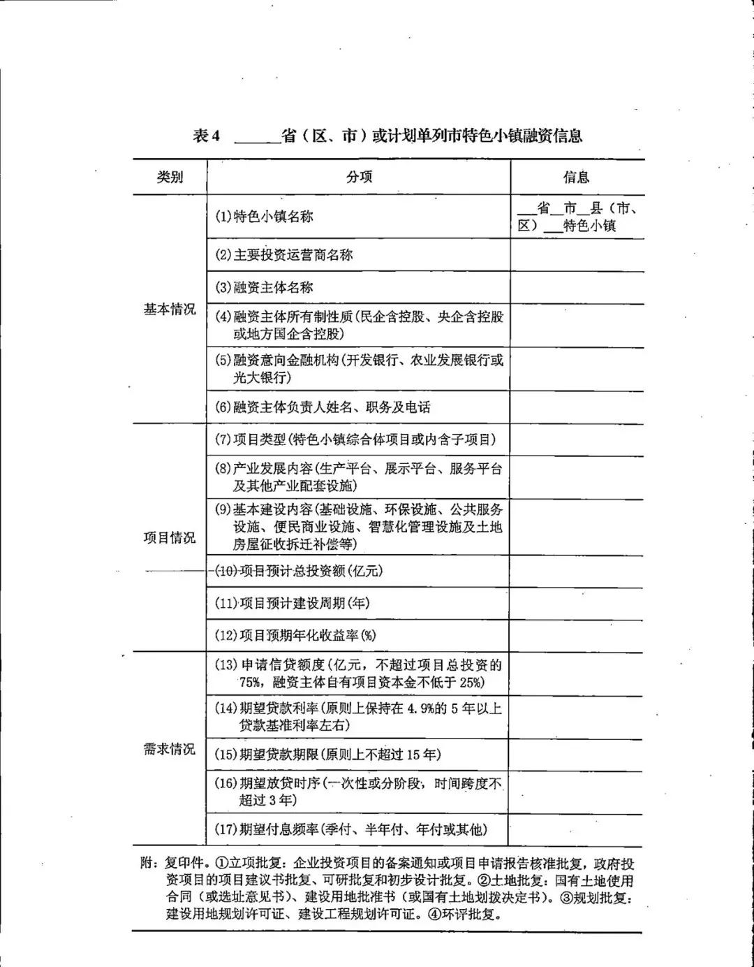 在附件表4《__省(區、市)或計劃單列市特征小鎮融資信息》中,有對特色小鎮建造的融資需求狀況的調研了解,包含請求信貸額度、期望信貸利率、期望借款期限、期望放貸時序、期望付息頻率等方面的信息,國家經過相關的銀行安排支撐特征小鎮展開。